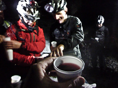 Further stop at top of Dentists descent for Barbarella, more hot wine and a Sloe Comfortable Screw before whooping down to the Church House for a Chrimbo feast, Butty manages another slide along the reservoir spillway path on the way!