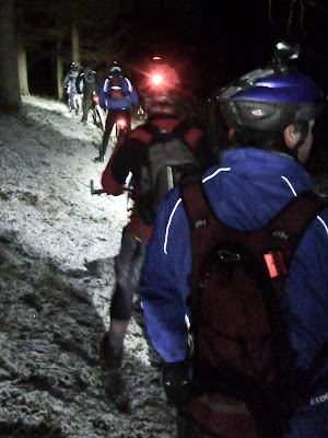 Off road & up hill finally gets us warmed up – so time to stop for PTD’s Dundee shots or Doogs Mulled wine. Slippery muddy single track looking a bit worn these days.