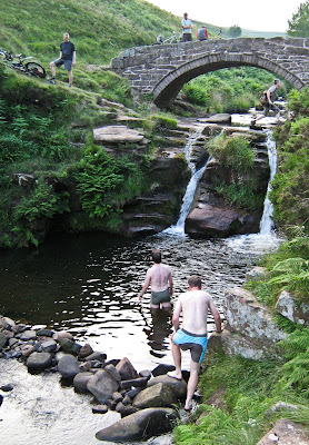 The youngsters raced to the Cat in near boiling conditions, amazing grass flowering white wisps across the tops, youff departing from 3 Shires ;-), wooaaah it was dangleberry shrivellingly deeply refreshing in the water, fab descent to Wildboarclough with plenty of offs!